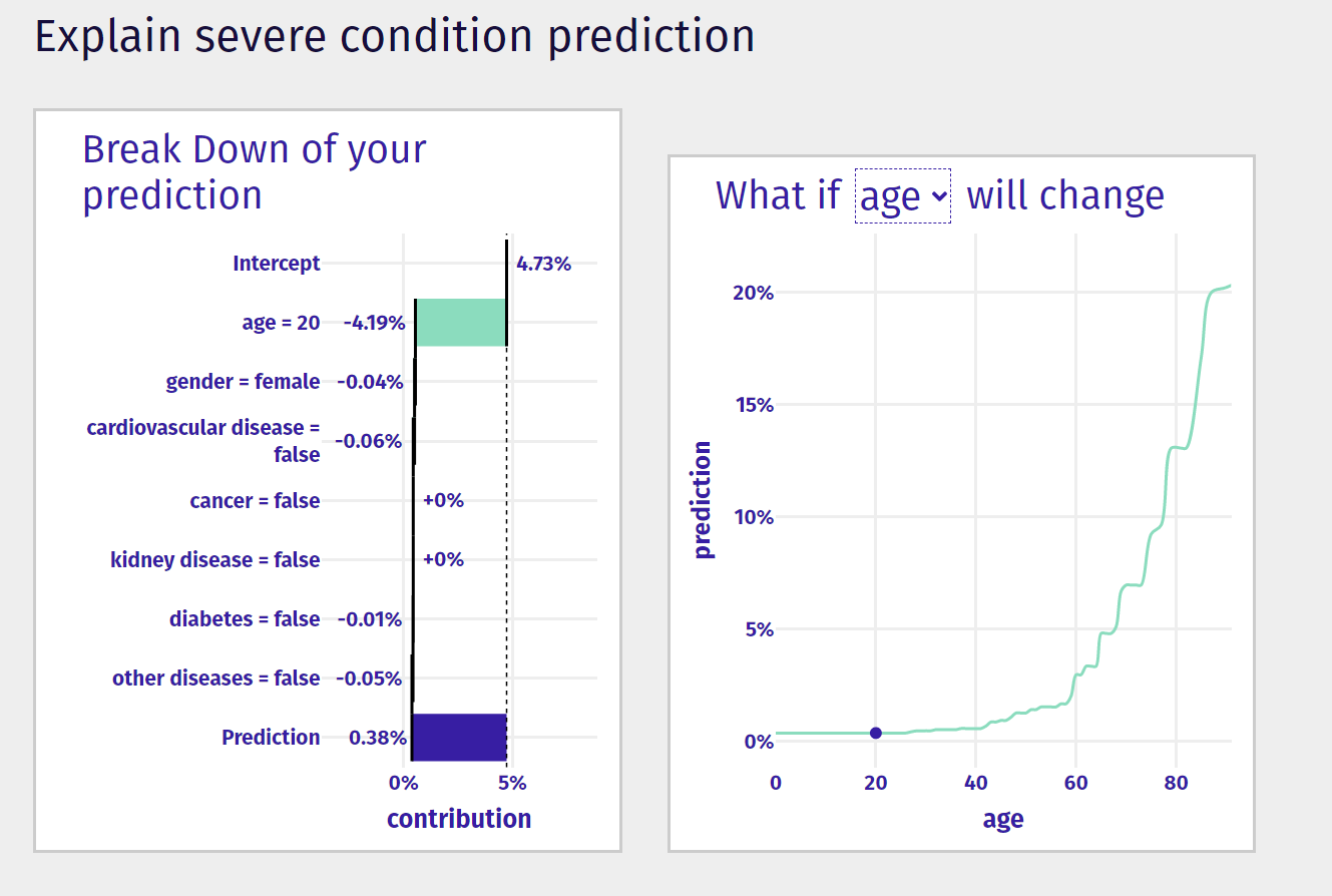 A perfect example of how the explainable AI is evolving right now is a model from MI2 DataLab and MOCOS. On their website, you can verify the prediction of how likely it is for a given patient to be severely ill or die from Covid-19, based on historical data. Using a form on their website, you can enter your age and accompanying diseases, and you get a more accurate prediction that’s presented clearly, and you can see what impacts the result of the model.