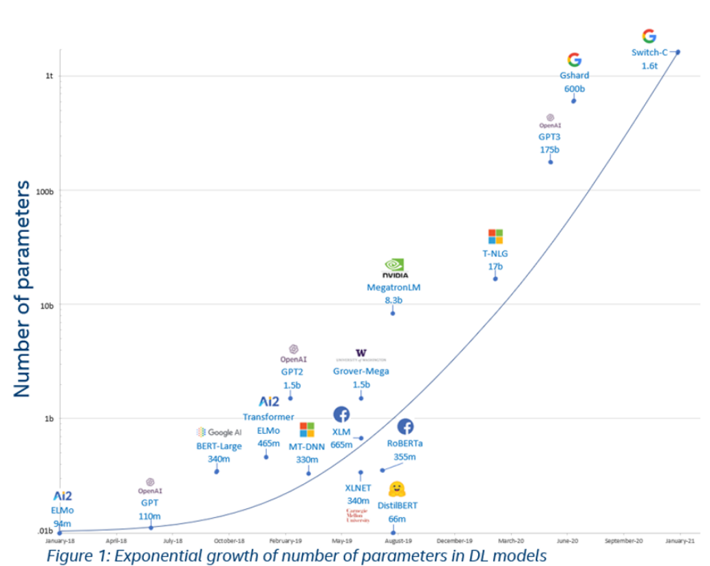 When it comes to the research area, there’s an increase in trends related to designing more and more advanced deep neural network architectures that uses large data sets and powerful computational clusters. Just look at what happens with AI language models – the number of parameters in these models grows exponentially. Google has already presented their model in Switch Transformer architecture that has 1.6 trillion parameters – 6 times more than the previous large model GPT-3 from OpenAI.
