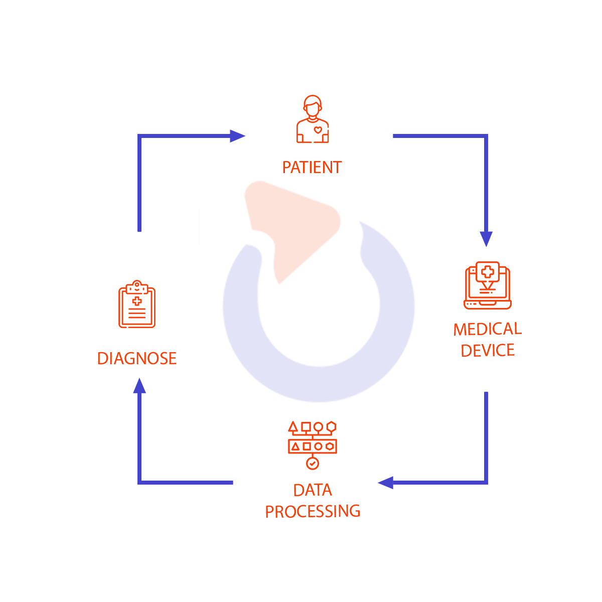 An important aspect of telemedicine: patient experience can be easily improved by using telehealth solutions. From a technical point of view, this is how the patient circulation data flow looks for any type of medical device developed at Spyrosoft: