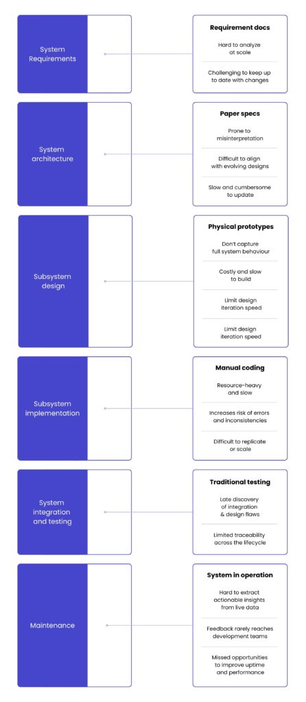 Traditional development processes often follow a linear path, with each stage handled in separate tools and environments. Manual handovers, fragmented workflows, and repeated rework introduce friction at every step, from defining system requirements all the way to deployment and operations.