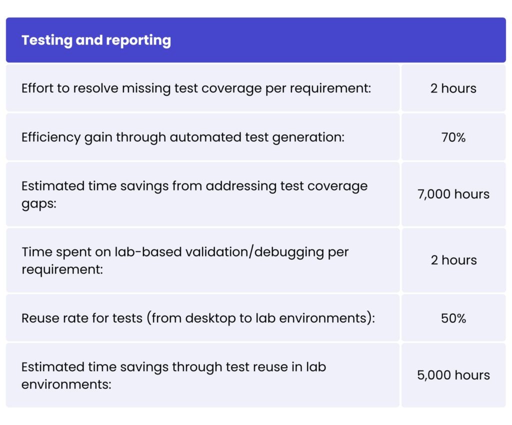 In a typical project with around 5,000 requirements, this approach can free up as much as 12,000 engineering hours. That’s time saved not just in testing, but in faster cycles, fewer errors, and smoother certification processes.