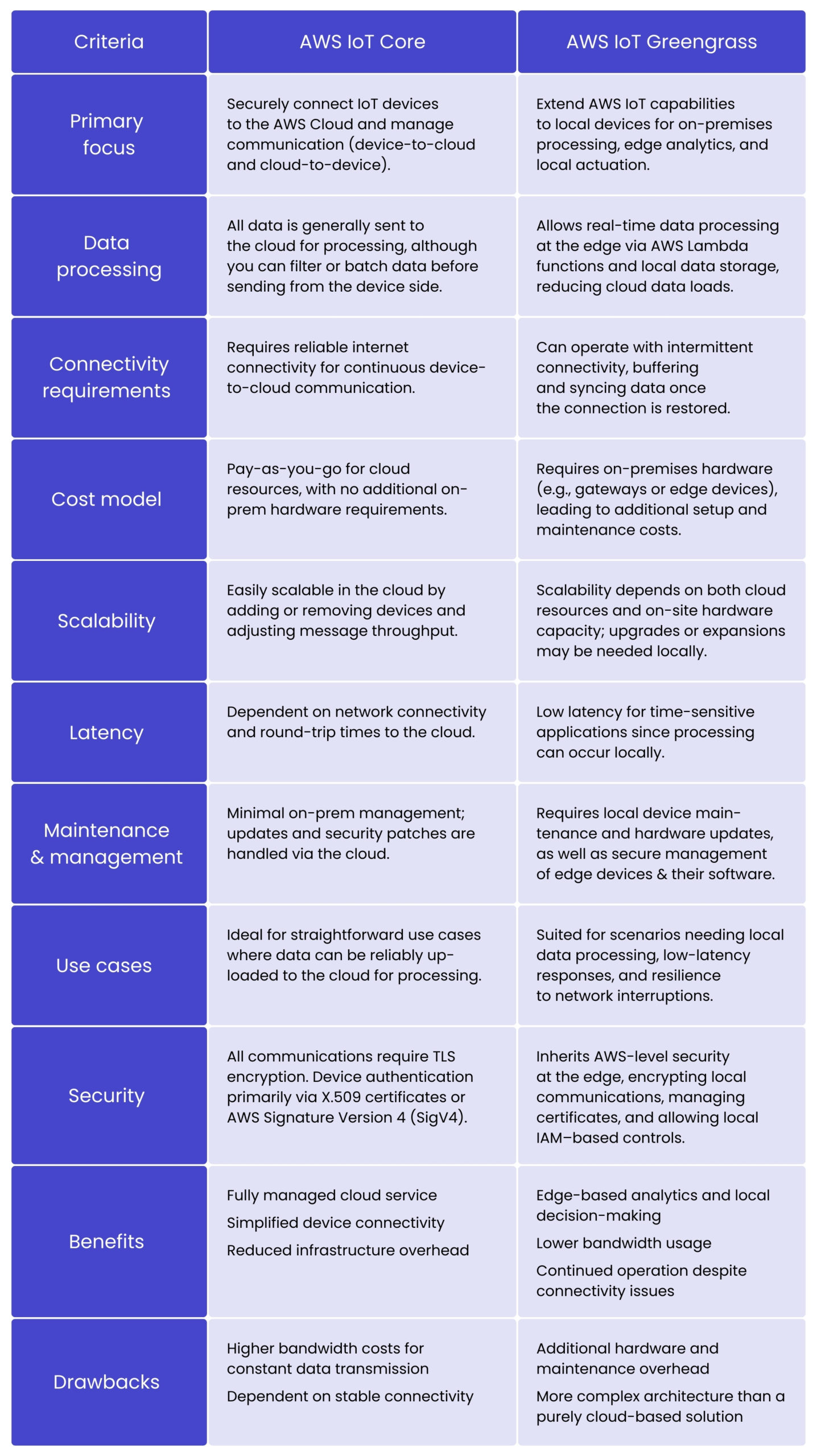 From a cost perspective, AWS IoT Core and AWS IoT Greengrass differ in infrastructure, data transfer, maintenance, scalability, connectivity, latency, and security. AWS IoT Core is a fully cloud-managed solution with lower upfront costs but higher cloud data costs and reliance on a stable internet. In contrast, AWS IoT Greengrass requires on-premises hardware, which increases upfront capital and maintenance requirements, but reduces cloud transfer costs and enables local decision making for faster, more resilient operations.