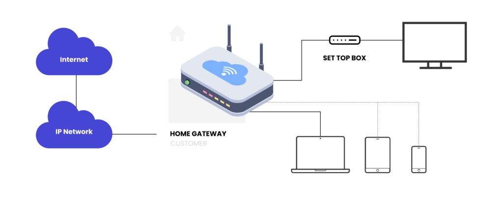 The digital content travels through private managed networks (offering consistent quality) or the public internet, reaching viewers’ homes via broadband connections.