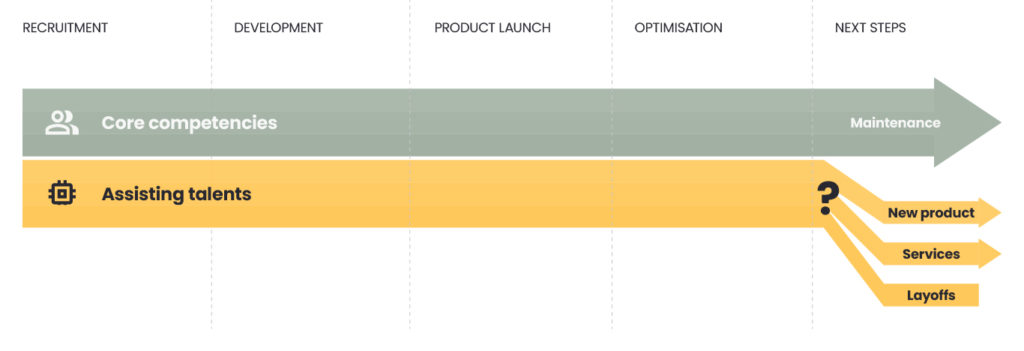 Looking at a startup’s team, you can find people from every field but some of those non-core talents are needed rather temporarily. After the product launch, part of the team might be left without a project because, until a new product is built, what remains is maintenance. Companies that don’t want to let these specialists go, often transition from the product to service model, although this wasn’t their initial strategic plan.