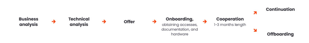 Then, we move towards making an offer, negotiating rates, and determining how much time we allocate for the initial phase. We don’t jump straight into a year-long collaboration but start with a shorter period, like a month or three.