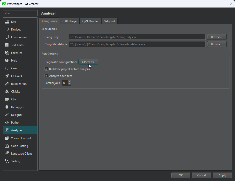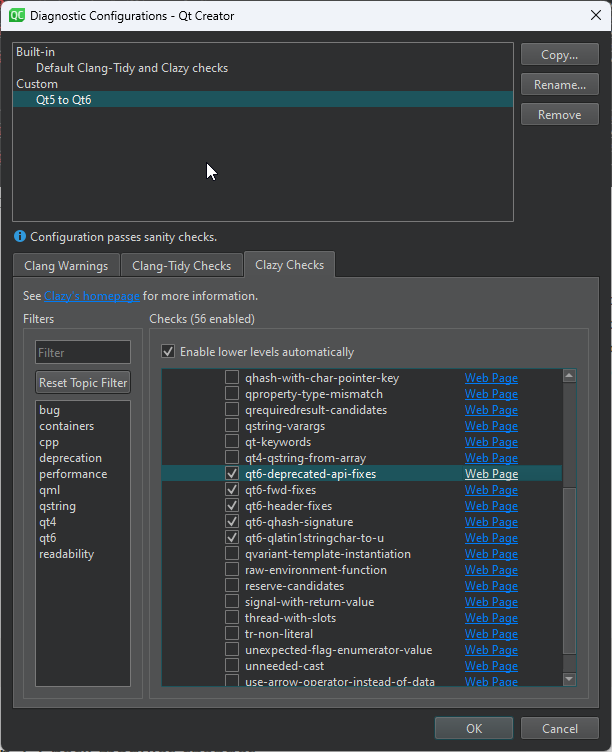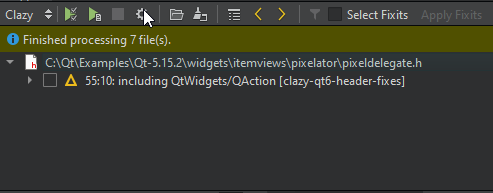 Clazy is a static analysis tool available as a plugin in QtCreator. Clazy can analyse the code and show you what should be improved. It is possible to tell Clazy explicitly what to check during execution. There are special options that need to be checked that can point to the part of the code that is not supported in Qt 6. Clazy is also able to fix these warnings itself, so the only thing you need to do is run the analyser.
