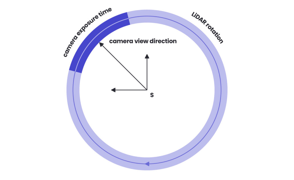 One example of additional sensor synchronisation factors is the camera’s global shutter triggering and the actual production of image data. First, the delay between triggering a camera’s global shutter and producing image data needs to be carefully managed, especially when synchronisation requires millisecond precision. Additionally, the synchronisation process must take into account the generally lower frequency of LiDAR systems compared to cameras. For LiDAR models that utilise a 360-degree rotational field, it’s also essential to align the LiDAR’s data coverage with the camera’s field of view, ensuring that the moments captured by both sensors correspond spatially and temporally for accurate data fusion.